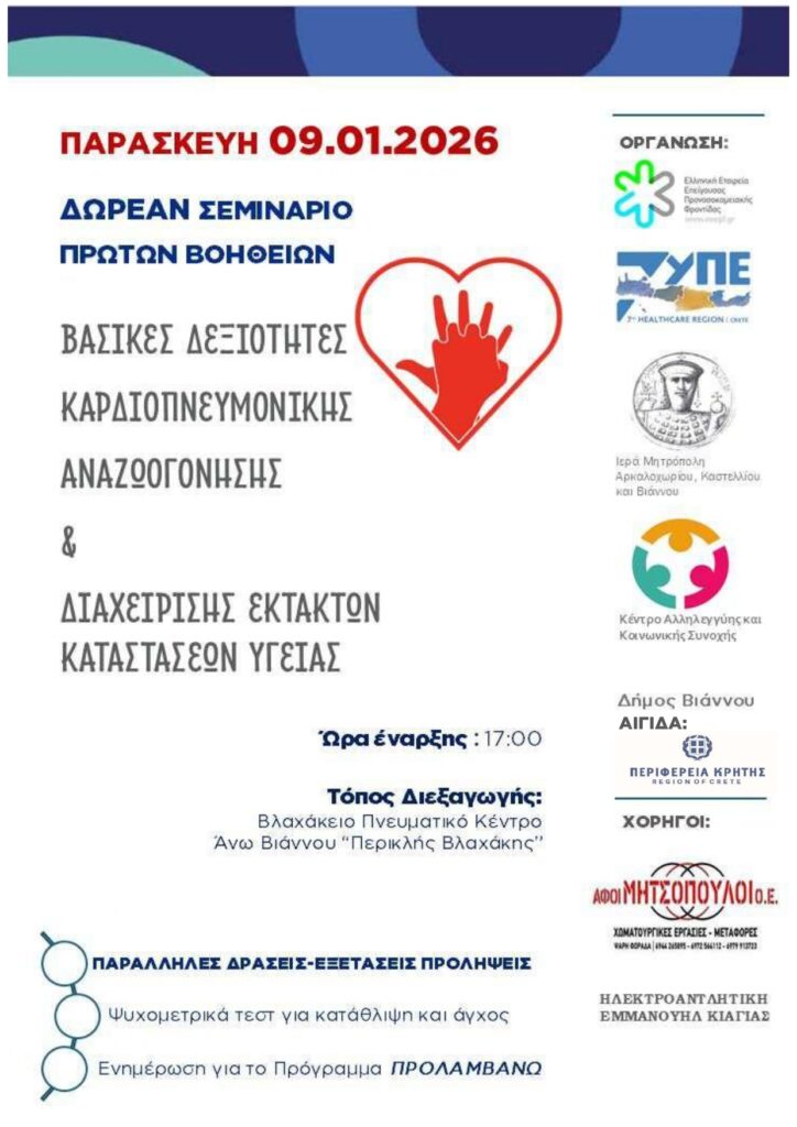 Στα πλάσια των δράσεων του κοινωνικου ιατρείου φαρμακείου του κέντρου αλληλεγγύης και κοινωνικης συνοχής, την Παρασκευή πραγματοποιηείται σεμινάριο πρώτων βοηθειών και αλλων εξετάσεων στην Βιάννο.