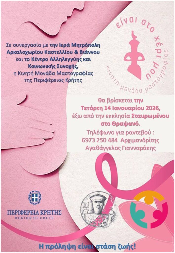 Μαστογραφίας της Περιφέρειας Κρήτης θα μπορεί να είναι στη διάθεσή σας την ΤΕΤΑΡΤΗ 14 ΙΑΝΟΥΑΡΙΟΥ 2026 στις 9:00 π.μ ΣΤΟ θΡΑΨΑΝΟ.